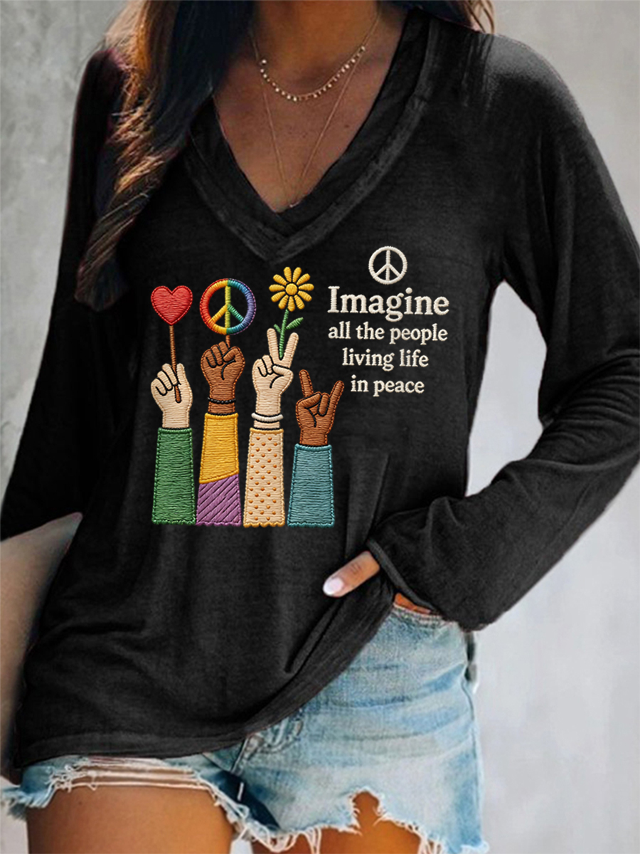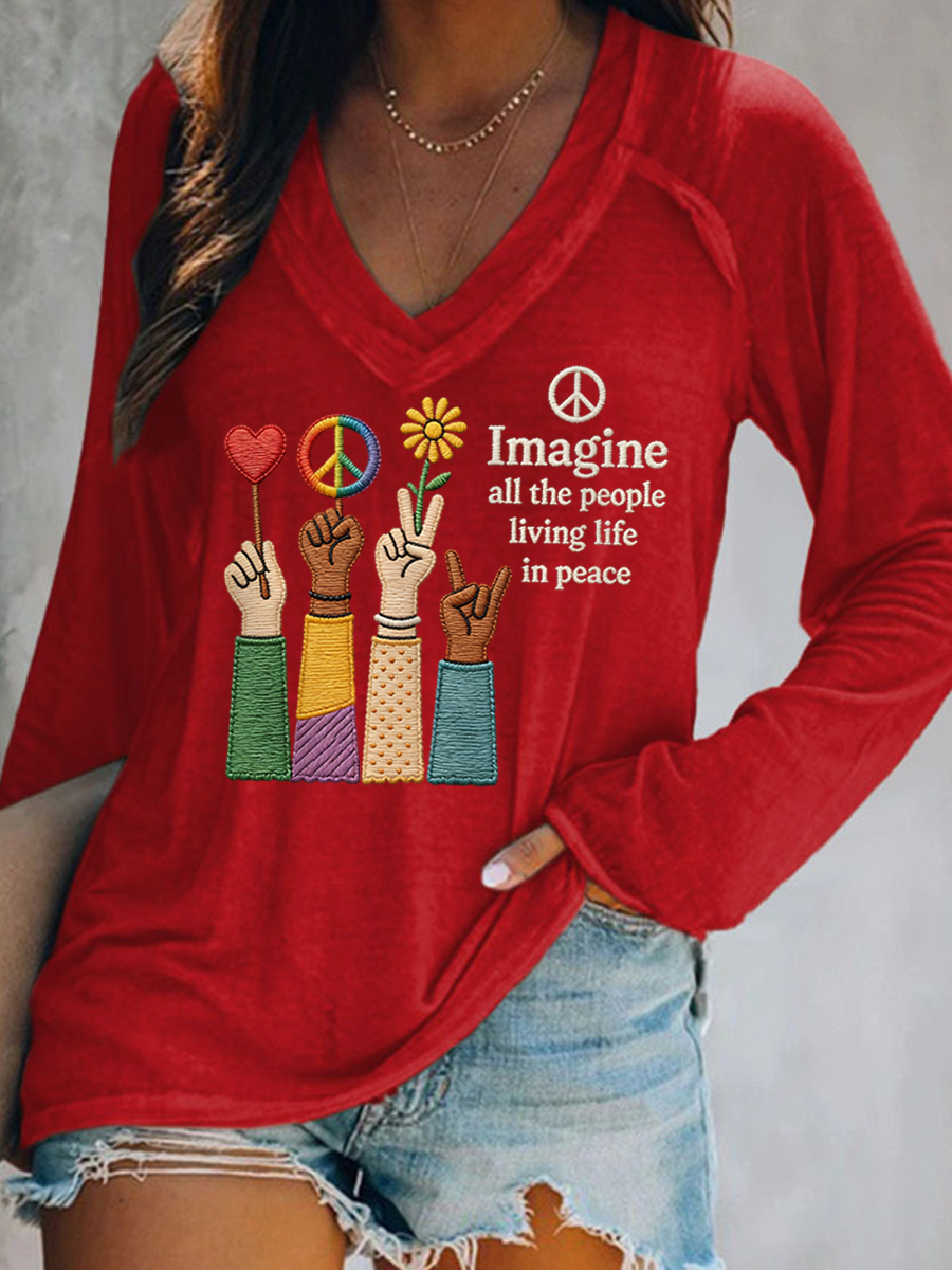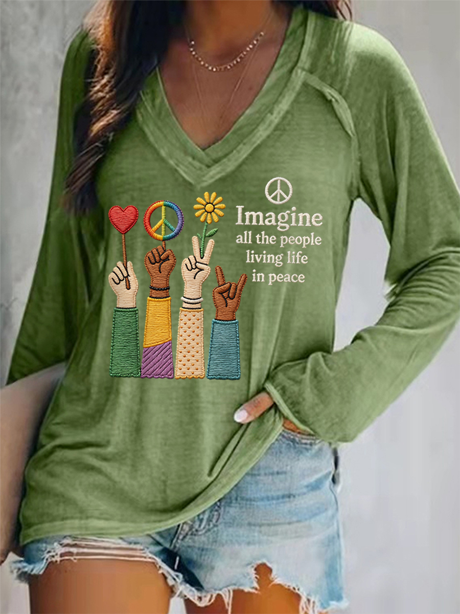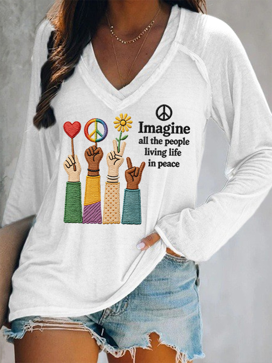 Women's Imagine All The People Living Life In Peace Print V-Neck Long-Sleeve T-Shirt