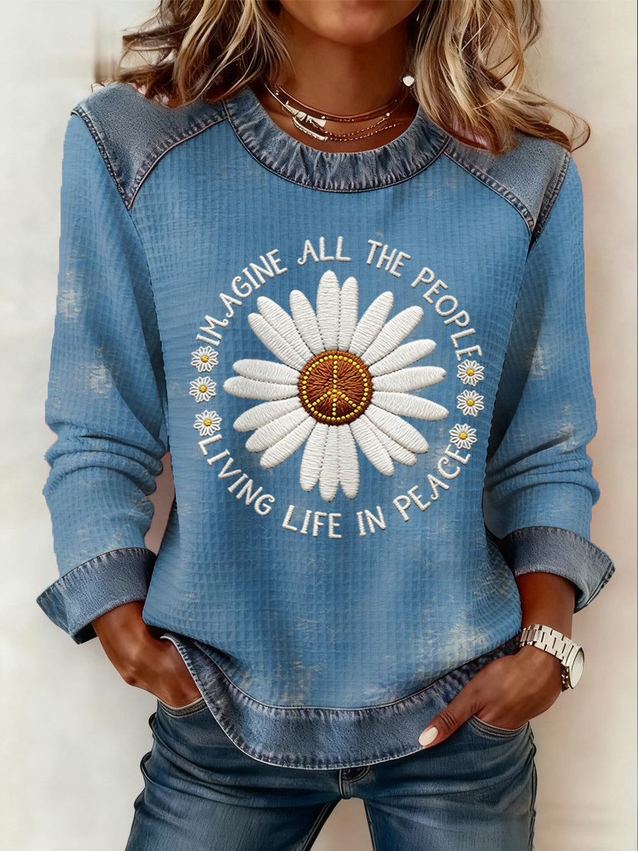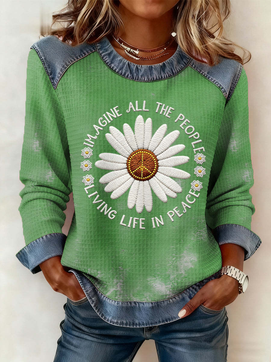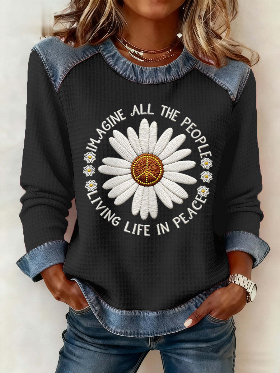 Women's Imagine All The People Living Life In Peace Print Denim Patchwork Top