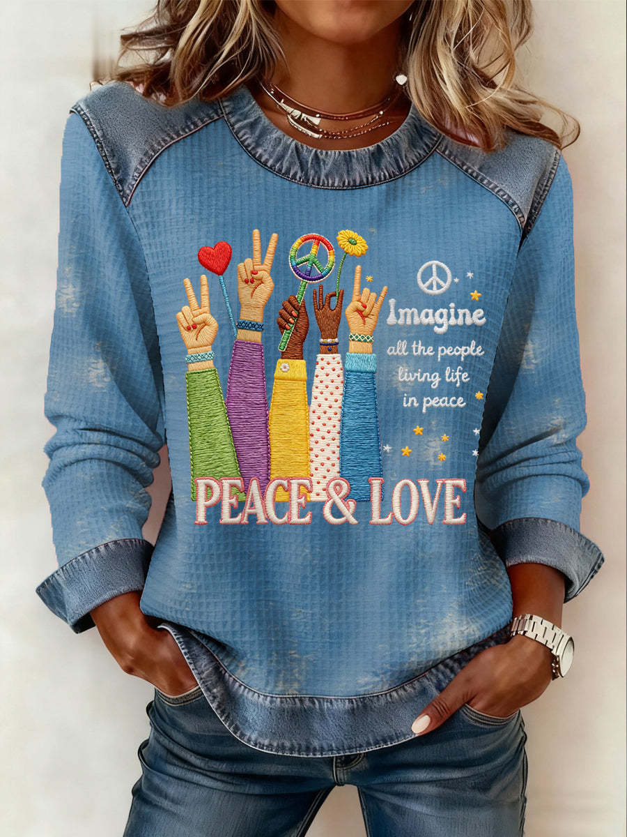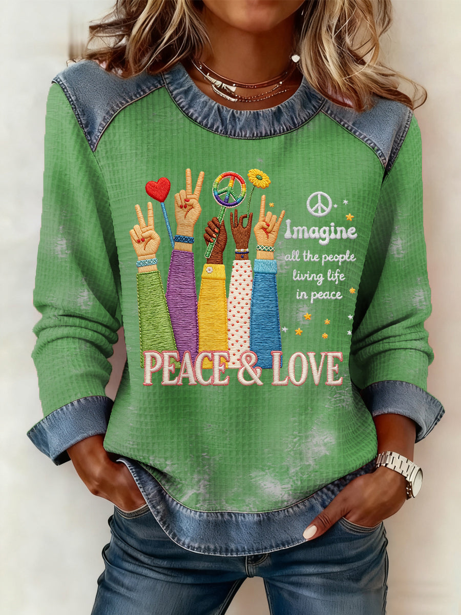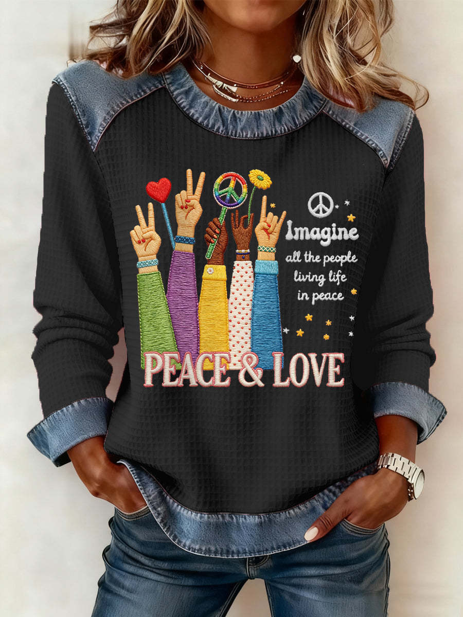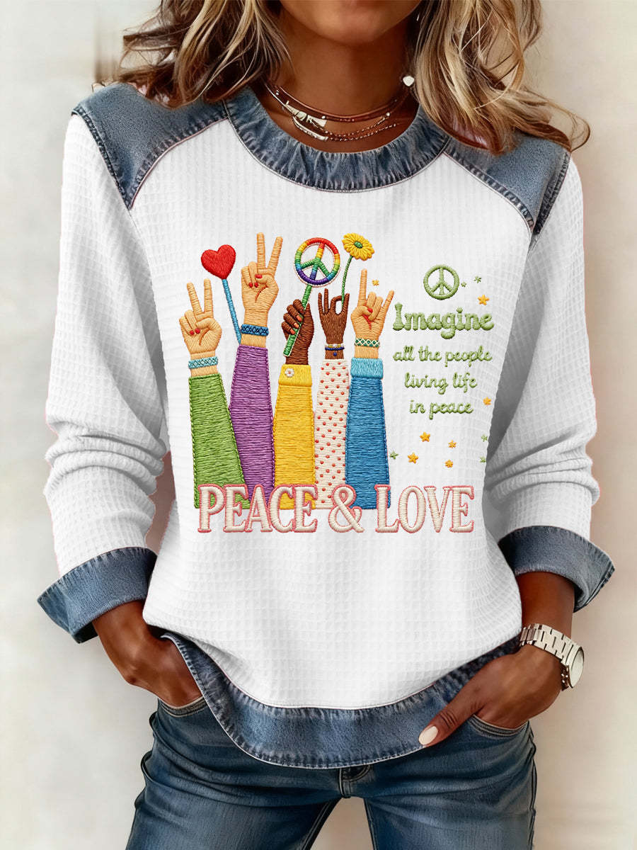 Women's Imagine All The People Living Life In Peace Print Denim Patchwork Top