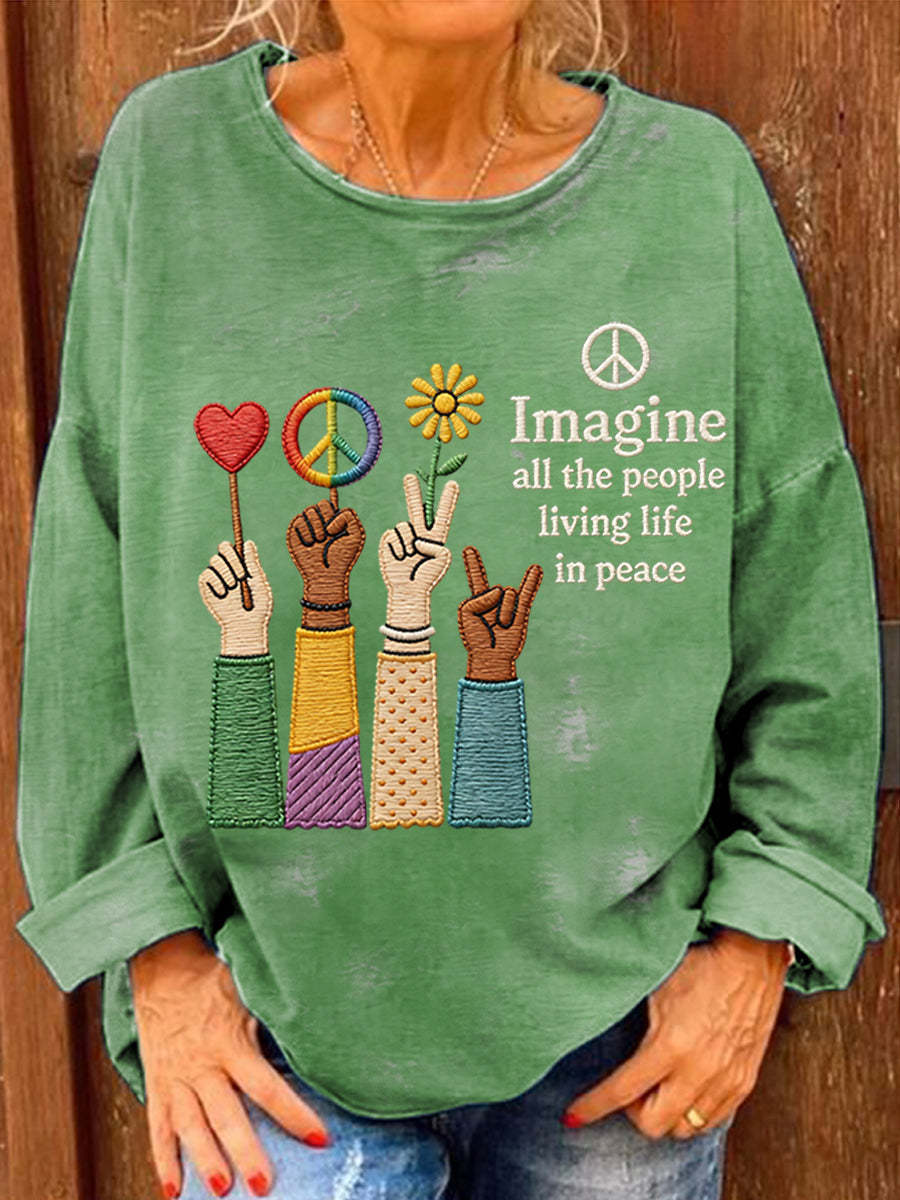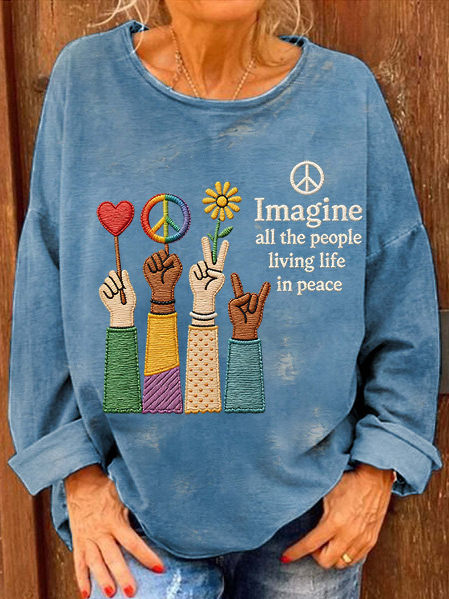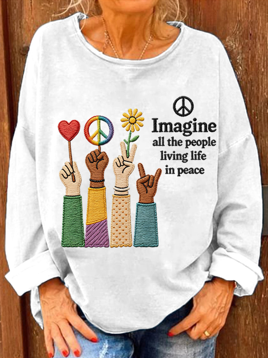 Women's Imagine All The People Living Life In Peace Print Casual Long-Sleeve Top