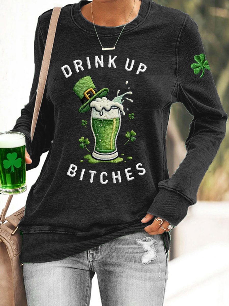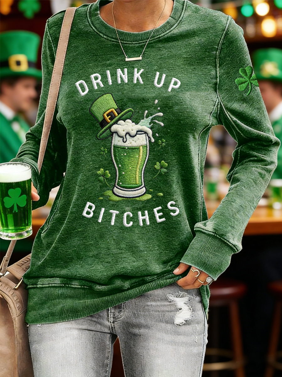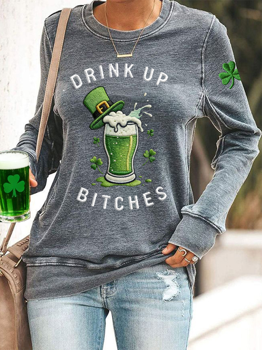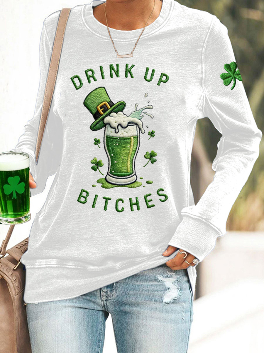 Women's Funny St. Patrick's Day Drink Up Bitches Green Beer Shamrock Print Casual Sweatshirt