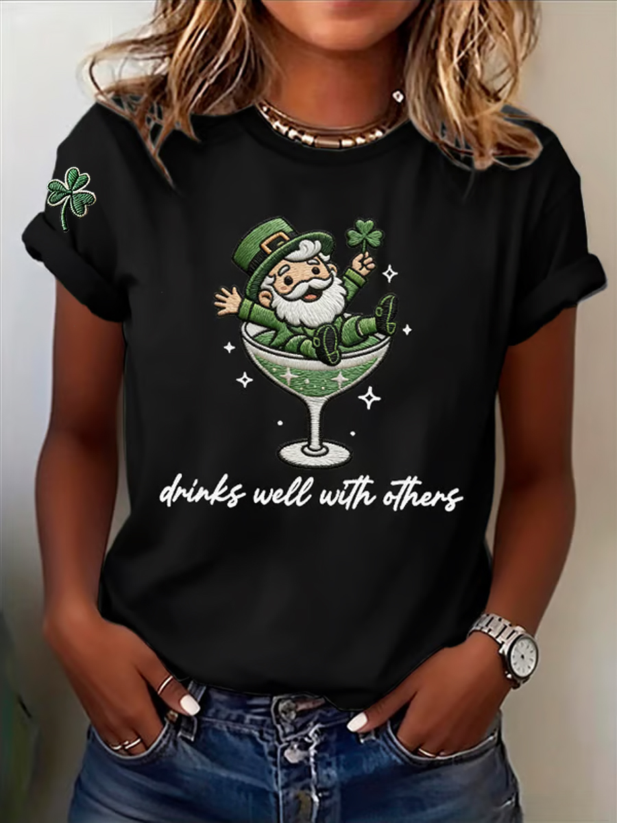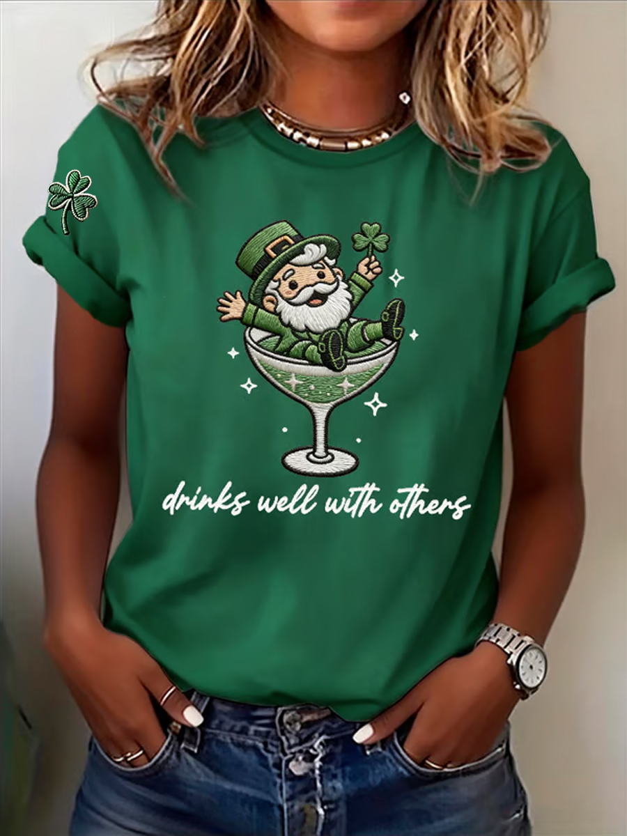 Women's St. Patrick's Day Drinks Well With Others Print Round Neck T-shirt